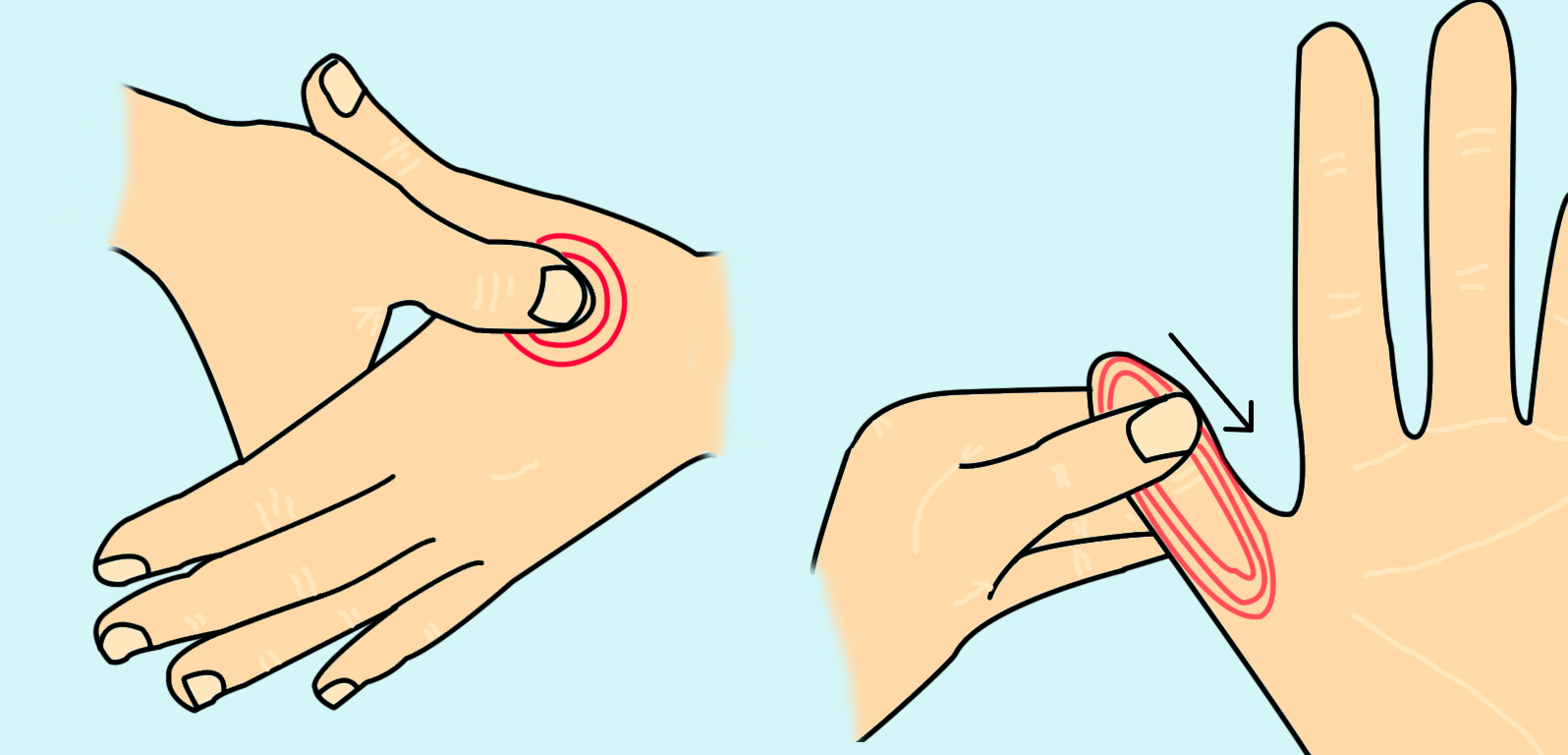ใช้นิ้วกลางนวดกระตุ้น 1 นาที โดยระหว่างนวดให้หายใจช้าๆ ทำให้ร่างกายรู้สึกสงบ